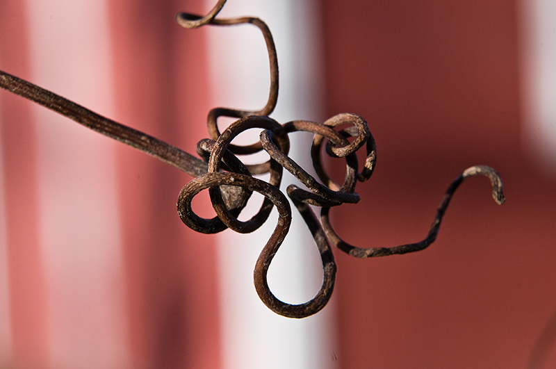 Intriguing and beautiful. The curling vine, is it grape or Virginia Creeper? Whichever, the drops of water set them off so nicely.